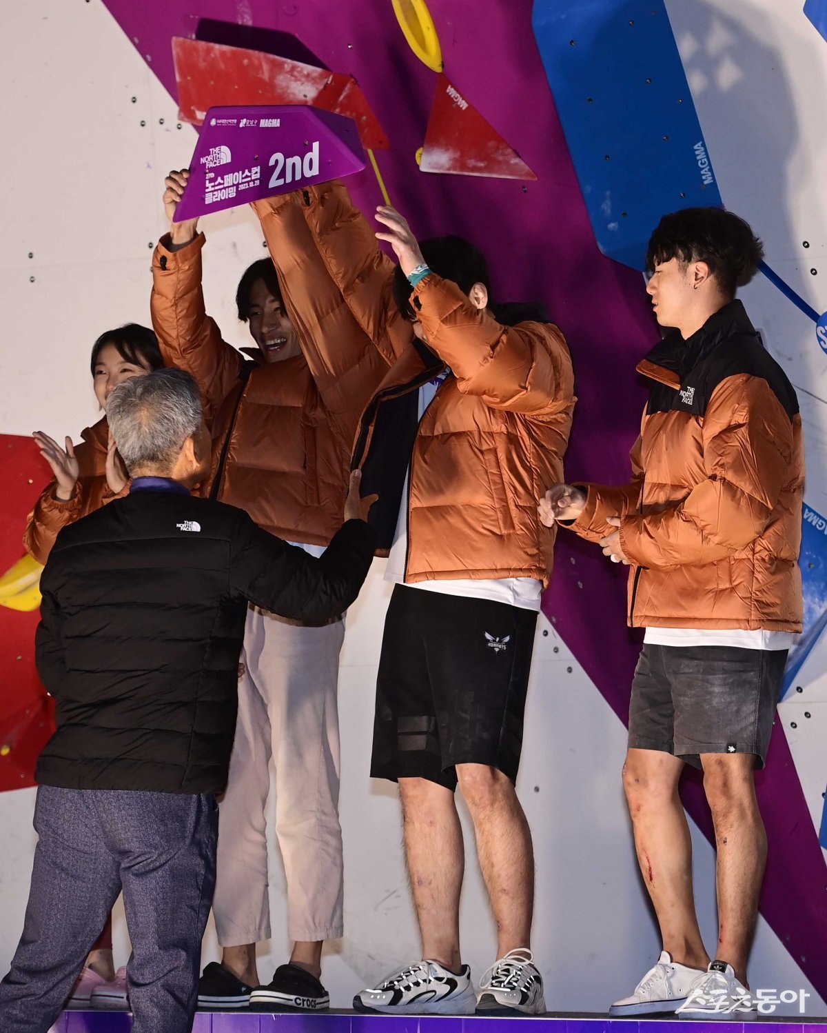 28일 서울 강남구 삼성동 코엑스 K-POP 광장 특성경기장에서 열린 ‘제27회 노스페이스컵 전국 스포츠클라이밍대회’에서 볼더링 2위를 차지한 도미노 팀이 트로피를 들어올리고 있다.
