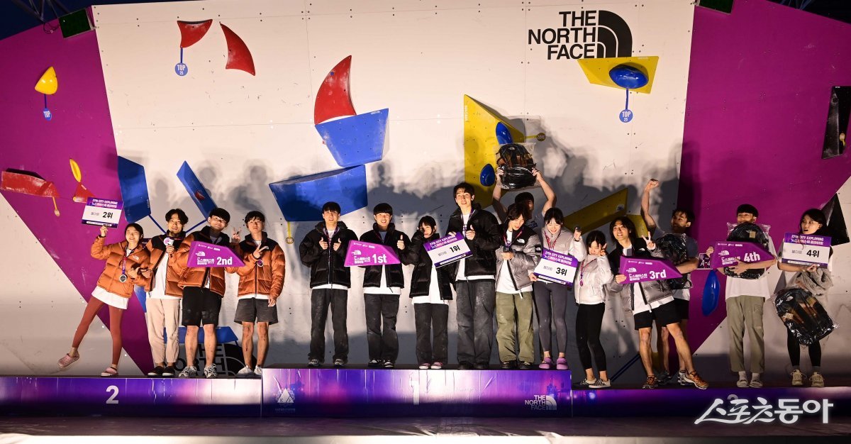 28일 서울 강남구 삼성동 코엑스 K-POP 광장 특성경기장에서 열린 ‘제27회 노스페이스컵 전국 스포츠클라이밍대회’에서 볼더링 1위 투쁠한우, 2위 도미노, 3위 팀 어스퀘이크, 4위 휘파람이 기념 촬영을 하고 있다.