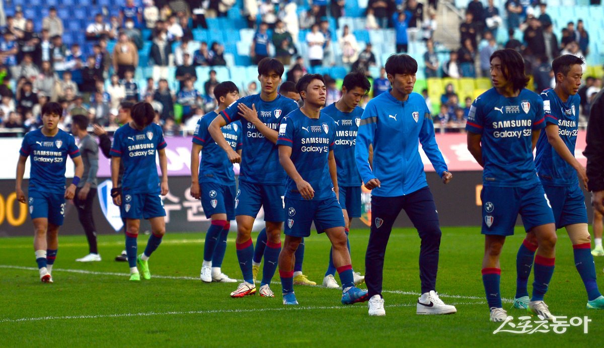 29일 수원월드컵경기장에서 열린 프로축구 ‘하나원큐 K리그1 2023’ 수원 삼성과 대전 하나시티즌과 경기에서 2-2 무승부를 기록하며 최하위 탈출에 실패한 수원 선수들이 아쉬워하고 있다.