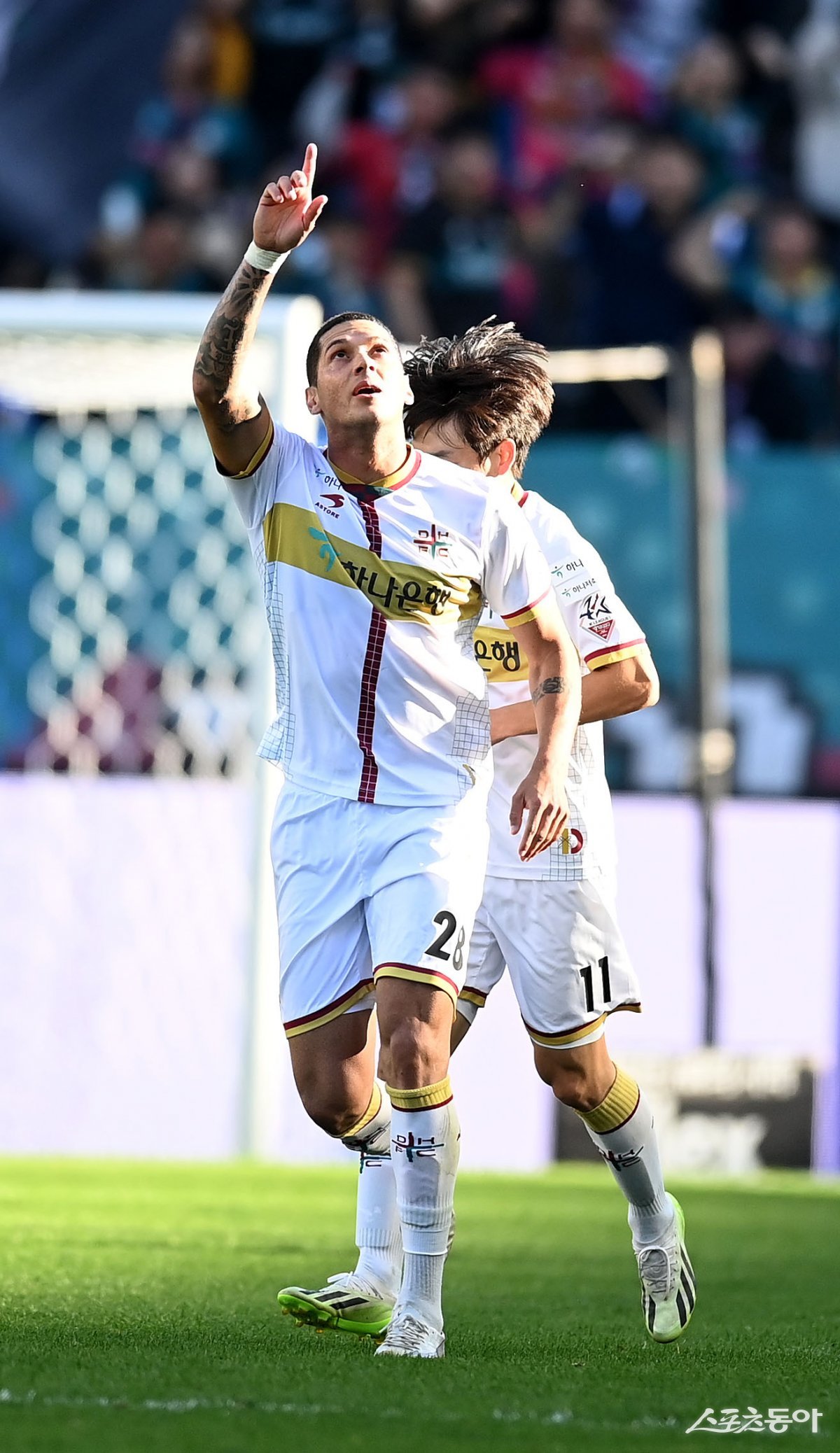 29일 수원월드컵경기장에서 열린 프로축구 ‘하나원큐 K리그1 2023’ 수원 삼성과 대전 하나시티즌과 경기에서 대전 티아고가 추격의 골을 성공시킨 후 기뻐하고 있다.