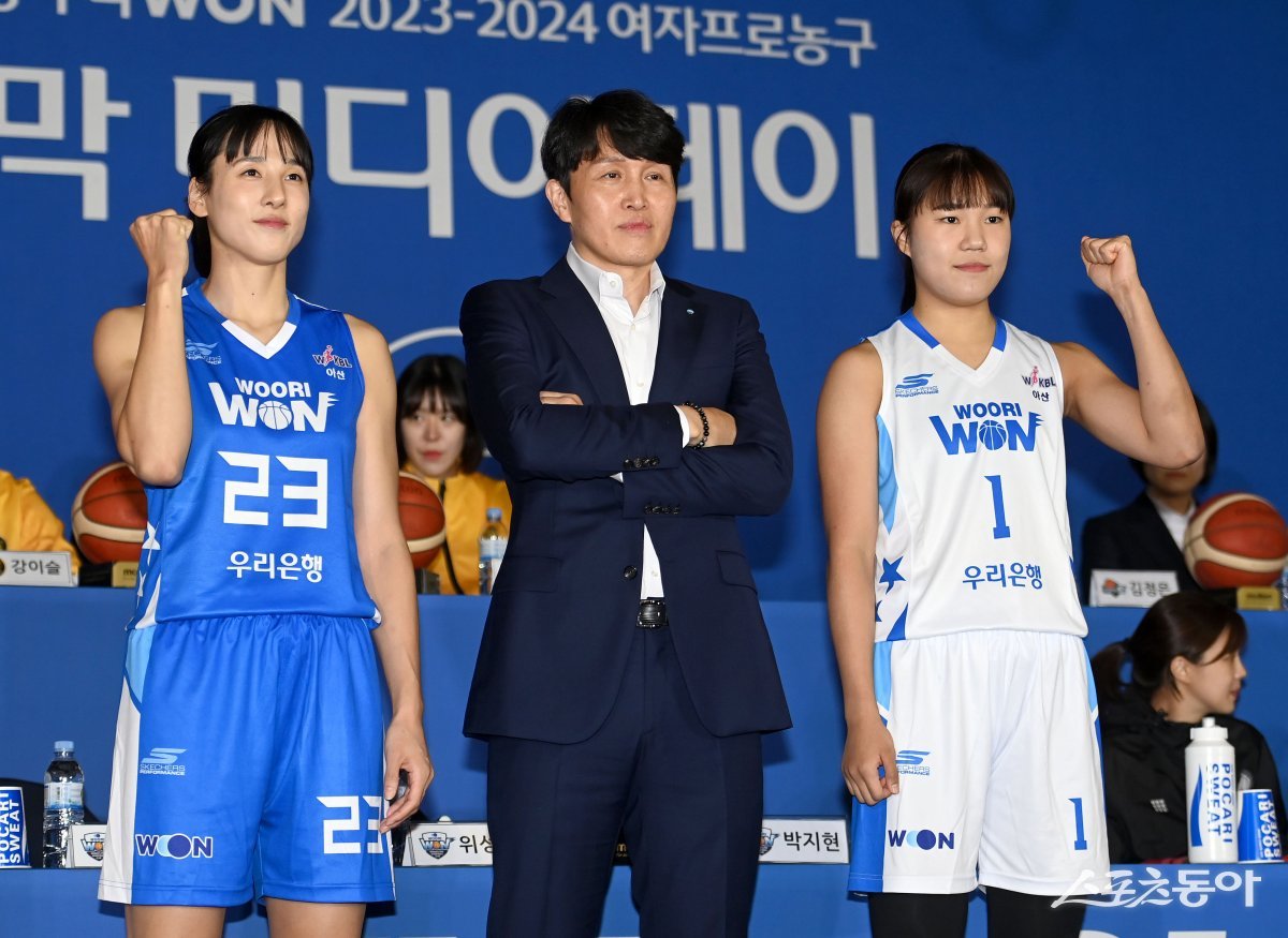 30일 서울 강남구 호텔리베라에서 열린 ‘우리은행 우리WON 2023~24 여자프로농구’ 개막 미디어데이에서 우리은행 김단비, 위성우 감독, 박지현이 포토타임을 갖고 있다.