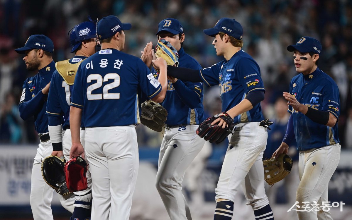 30일 경기도 수원KT위즈파크에서 열린 ‘2023 KBO 포스트시즌’ KT 위즈와 NC 다이노스의 플레이오프 1차전 경기에서 9-5로 승리한 NC 선수들이 기쁨을 나누고 있다.