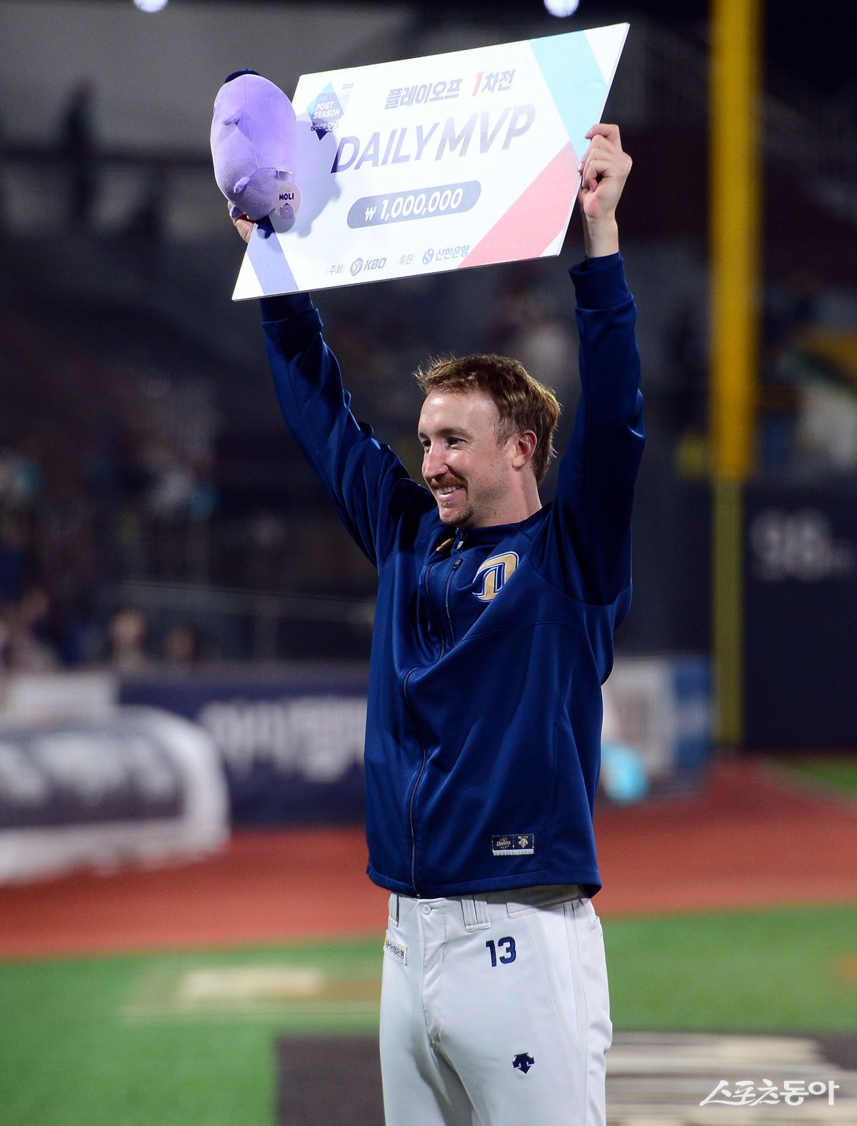 30일 경기도 수원 kt위즈파크에서 ‘2023 신한은행 SOL KBO리그’ kt 위즈와 NC 다이노스의 플레이오프 1차전 경기가 열렸다. NC가 kt를 상대로 9-5 승리를 거둔 후 데일리 MVP를 수상한 페디가 기념촬영을 하고 있다.