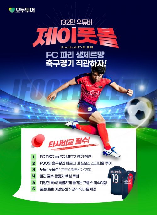 모두투어는 구독자 135만의 축구 유튜버 제이풋볼과 함께 떠나는 ‘PSG 경기 직관 투어 모두픽 파리 6일’ 상품을 내놓았다.축구 유튜버 제이풋볼 동행, 스타디움 투어도