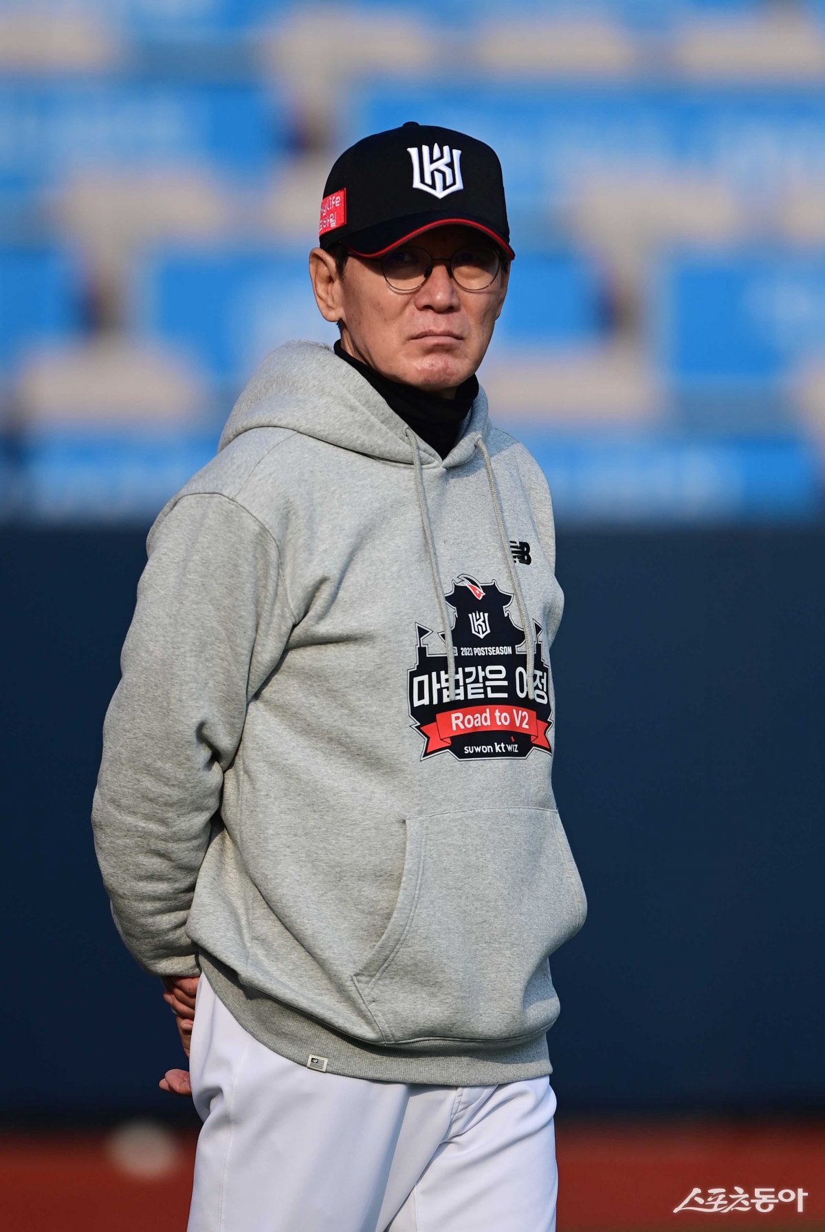 31일 경기도 수원KT위즈파크에서 열린 ‘2023 KBO 포스트시즌’ KT 위즈와 NC 다이노스의 플레이오프 2차전 경기에 앞서 KT 이강철 감독이 선수들에 훈련을 지켜보고 있다.