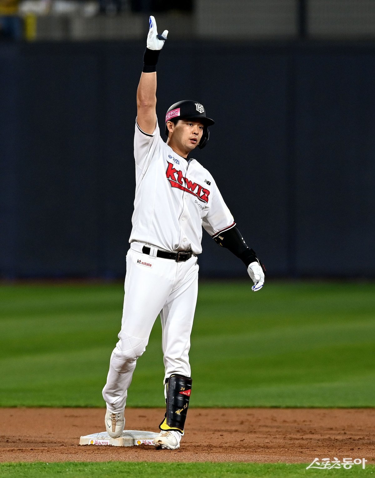 31일 경기도 수원 kt위즈파크에서 ‘2023 신한은행 SOL KBO리그’ kt 위즈와 NC 다이노스의 플레이오프 2차전 경기가 열렸다. 2회말 2사에서 kt 문상철이 2루타를 날린 후 환호하고 있다.