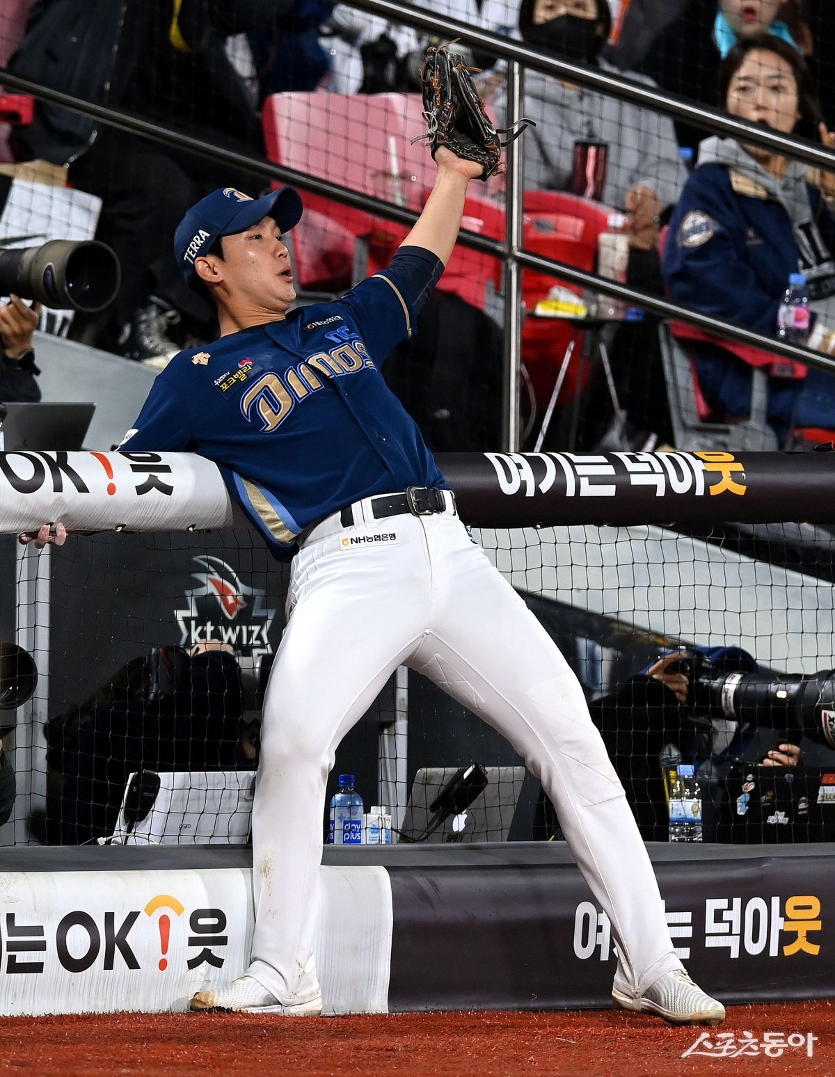 31일 경기도 수원 kt위즈파크에서 ‘2023 신한은행 SOL KBO리그’ kt 위즈와 NC 다이노스의 플레이오프 2차전 경기가 열렸다. 5회말 2사에서 파울 타구를 kt 서호철이 잡아내고 있다.