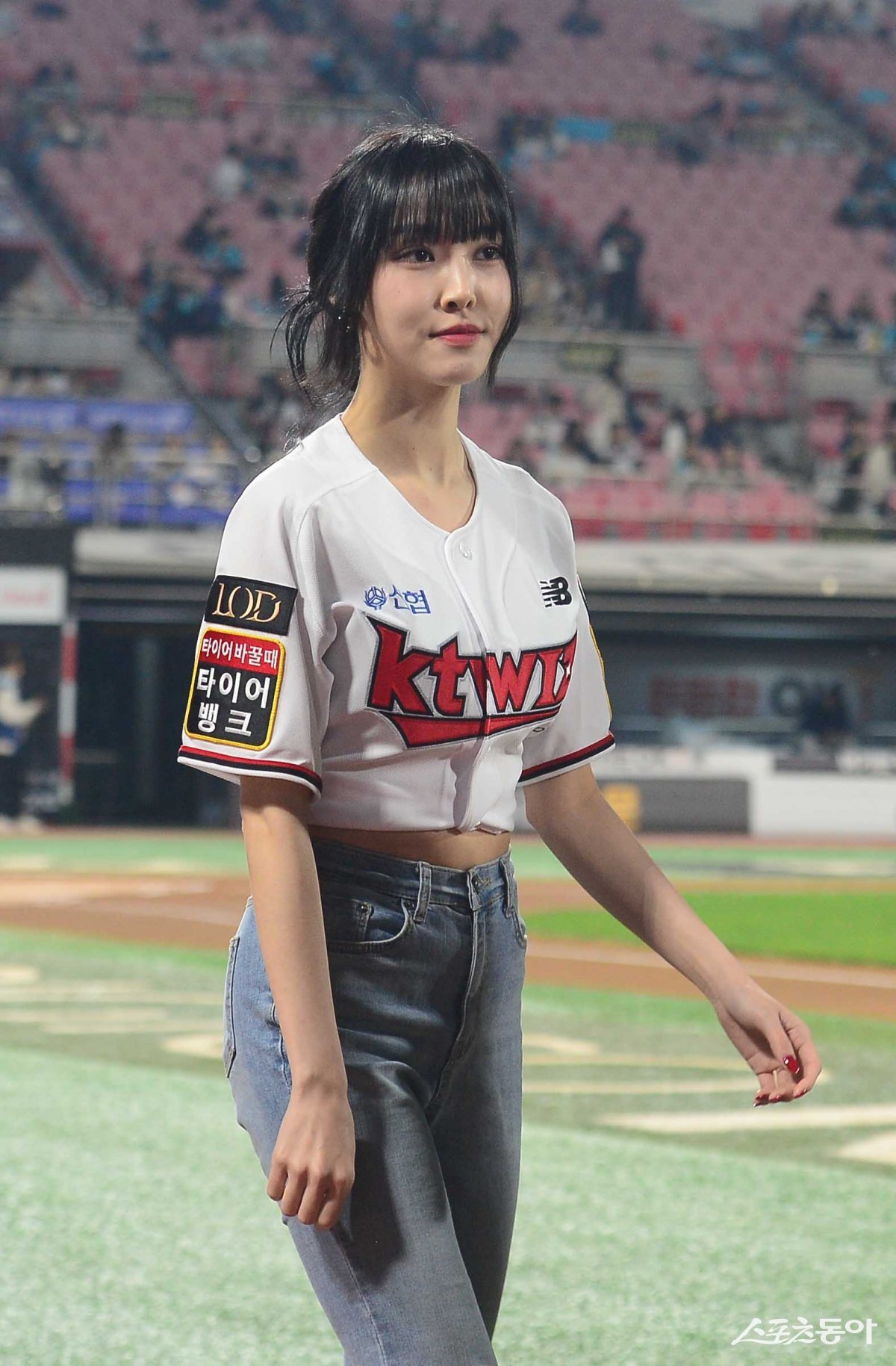 31일 경기도 수원KT위즈파크에서 열린 ‘2023 KBO 포스트시즌’ KT 위즈와 NC 다이노스의 플레이오프 2차전 경기에 앞서 가수 유주가 시구 연습을 위해 불펜으로 향하고 있다.