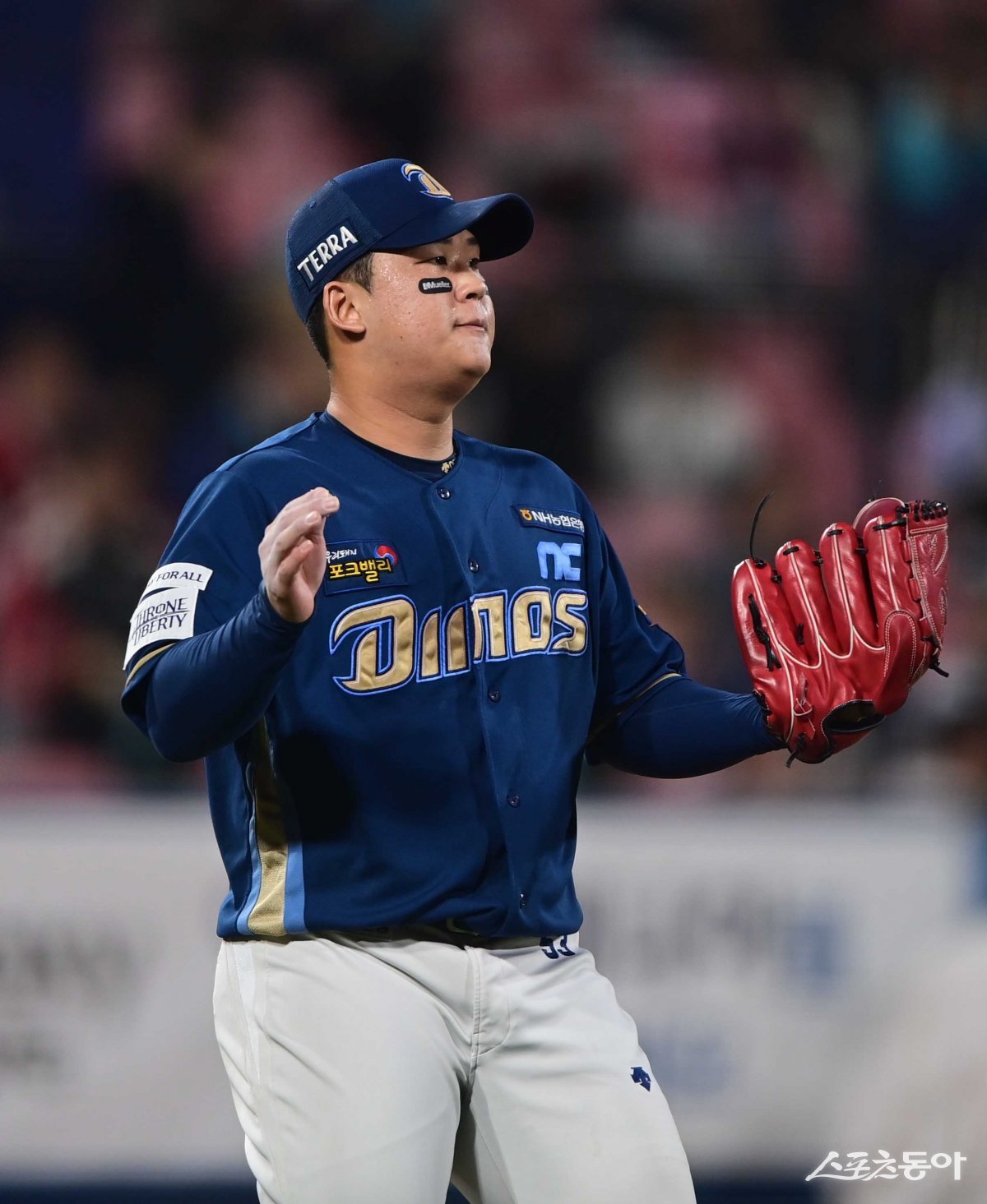 31일 경기도 수원KT위즈파크에서 열린 ‘2023 KBO 포스트시즌’ KT 위즈와 NC 다이노스의 플레이오프 2차전 경기에서 4회말 수비를 마친 NC 신민혁이 손뼉을 치고 있다.