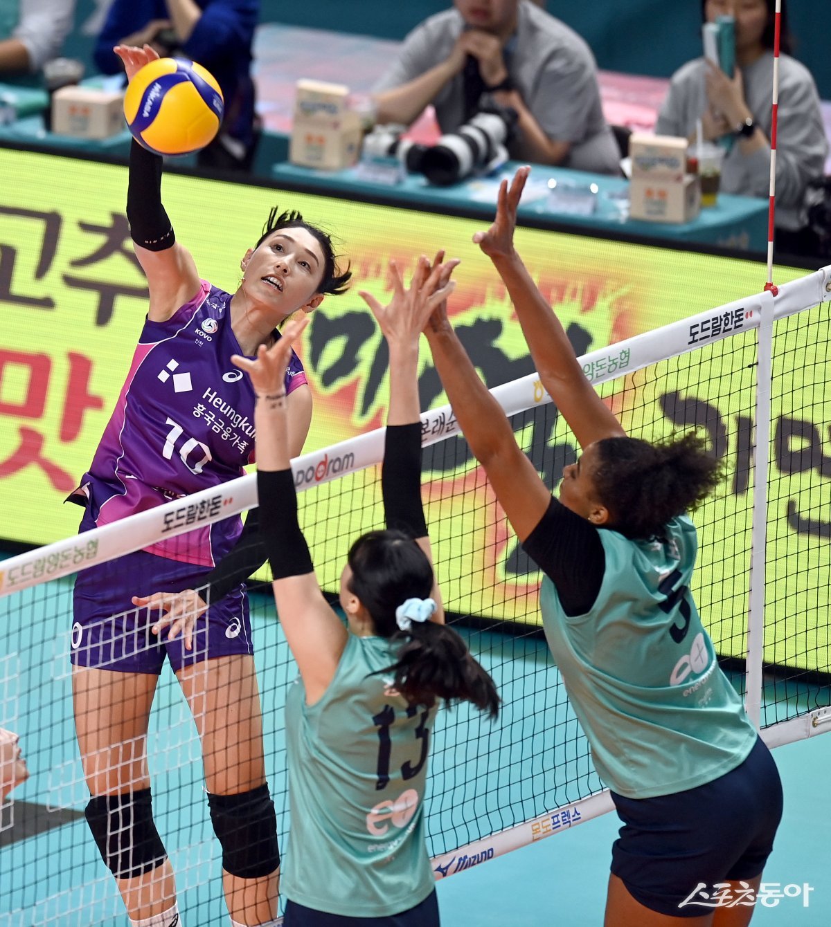 31일 서울 장충체육관에서 열린 ‘도드람 2023~2024 V-리그’ 여자부 GS칼텍스와 흥국생명 경기에서 흥국생명 김연경이 GS칼텍스의 블로킹 사이로 스파이크를 날리고 있다.
