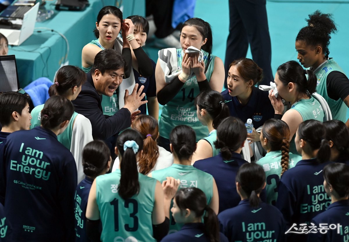 31일 서울 장충체육관에서 열린 ‘도드람 2023~2024 V-리그’ 여자부 GS칼텍스와 흥국생명 경기에서 GS칼텍스 차상현 감독이 작전 지시를 하고 있다.