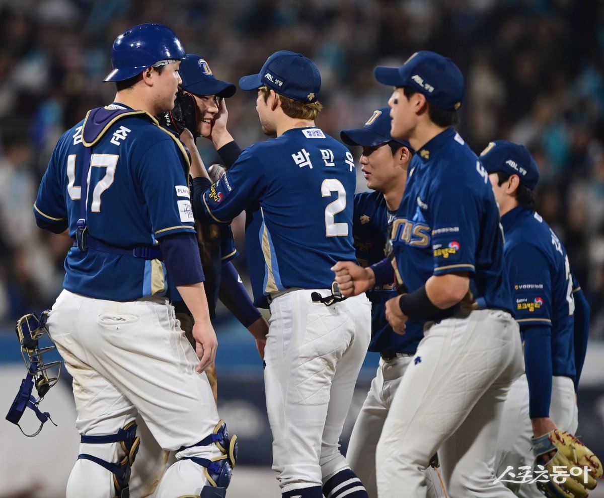 31일 경기도 수원KT위즈파크에서 열린 ‘2023 KBO 포스트시즌’ KT 위즈와 NC 다이노스의 플레이오프 2차전 경기에서 3-2로 승리한 NC 김주원이 동료들에 축하를 받고 있다.