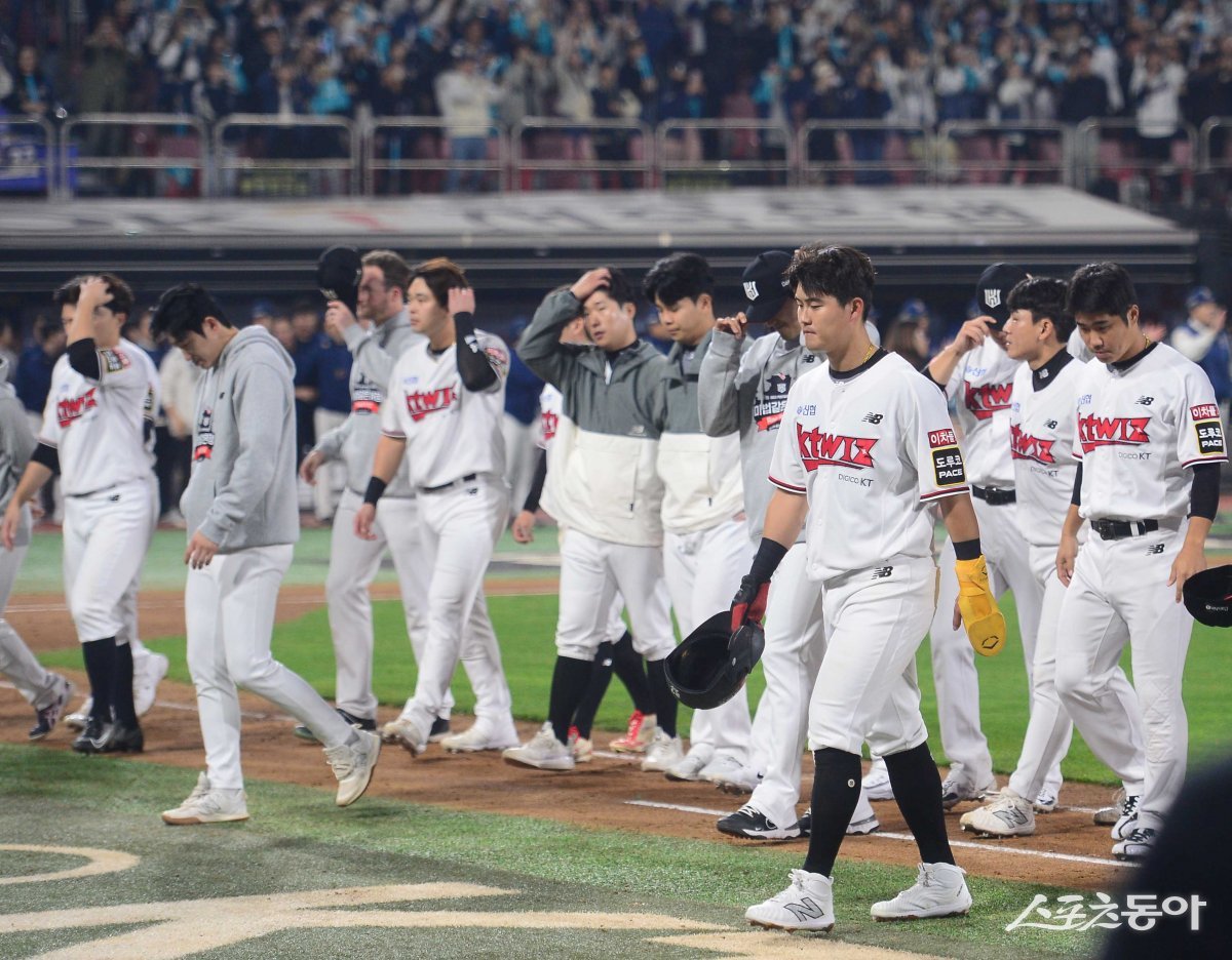 31일 경기도 수원KT위즈파크에서 열린 ‘2023 KBO 포스트시즌’ KT 위즈와 NC 다이노스의 플레이오프 2차전 경기에서 2-3으로 패한 KT 선수들이 아쉬워하고 있다.