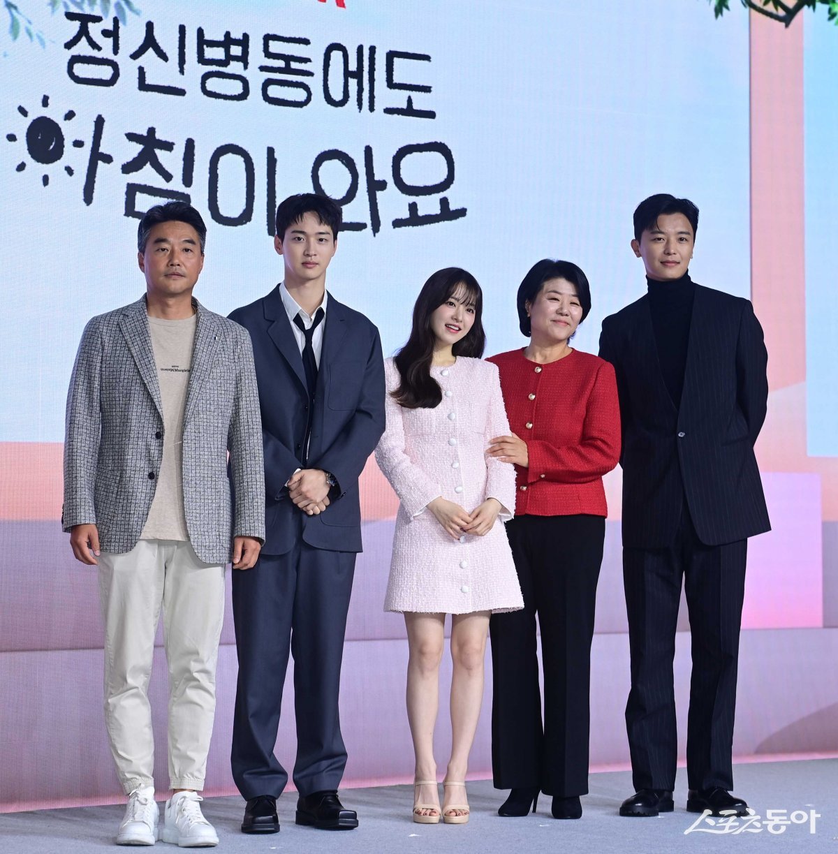 이재규 감독, 배우 장동윤, 박보영, 이정은, 연우진이 1일 서울 종로구 JW메리어트 동대문스퀘어서울에서 열린 넷플릭스 ‘정신병동에도 아침이 와요’ 제작발표회에서 포즈를 취하고 있다