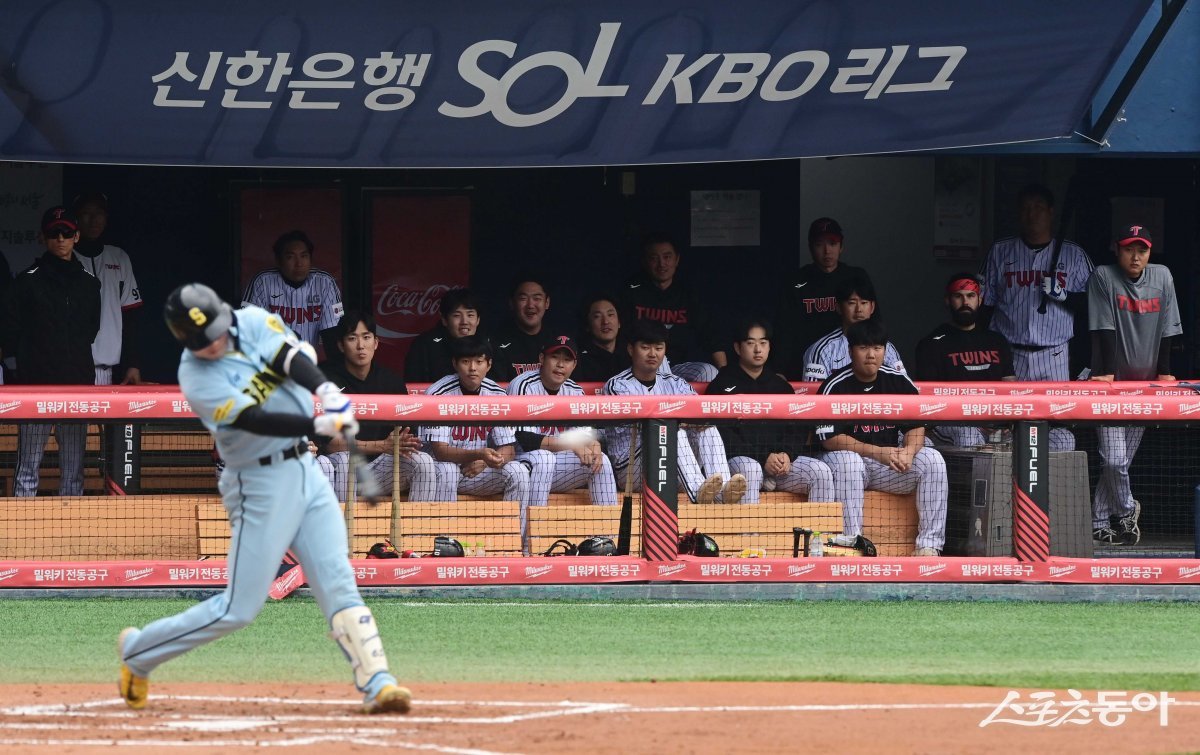 1일 서울 잠실야구장에서 열린 ‘2023 KBO 포스트시즌’ 한국시리즈를 대비한 LG 트윈스와 상무 야구단의 평가전에서 LG 선수들이 경기를 지켜보고 있다.