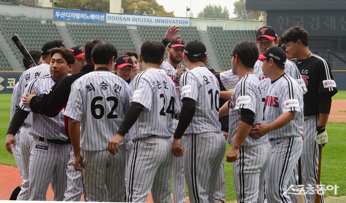 1일 서울 잠실야구장에서 열린 ‘2023 KBO 포스트시즌’ 한국시리즈를 대비한 LG 트윈스와 상무 야구단의 평가전 경기에 앞서 LG 선수들이 팀 미팅을 하고 있다.