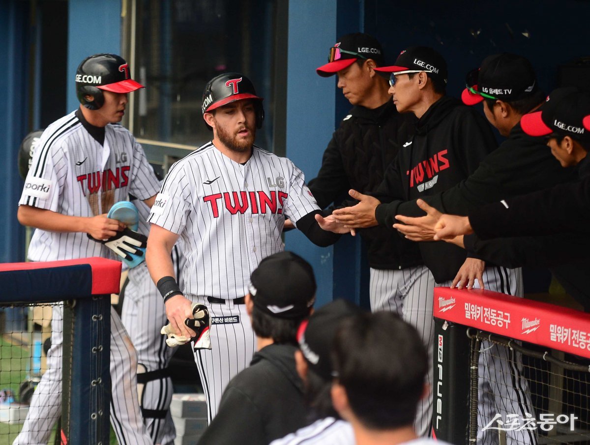 1일 서울 잠실야구장에서 열린 ‘2023 KBO 포스트시즌’ 한국시리즈를 대비한 LG 트윈스와 상무 야구단의 평가전 경기에서 4회말 무사 1, 3루 LG의 우전 2루타 때 1루주자 오스틴과 3루주자 최승민이 득점에 성공한 후 더그아웃에서 동료들에 축하를 받고 있다.