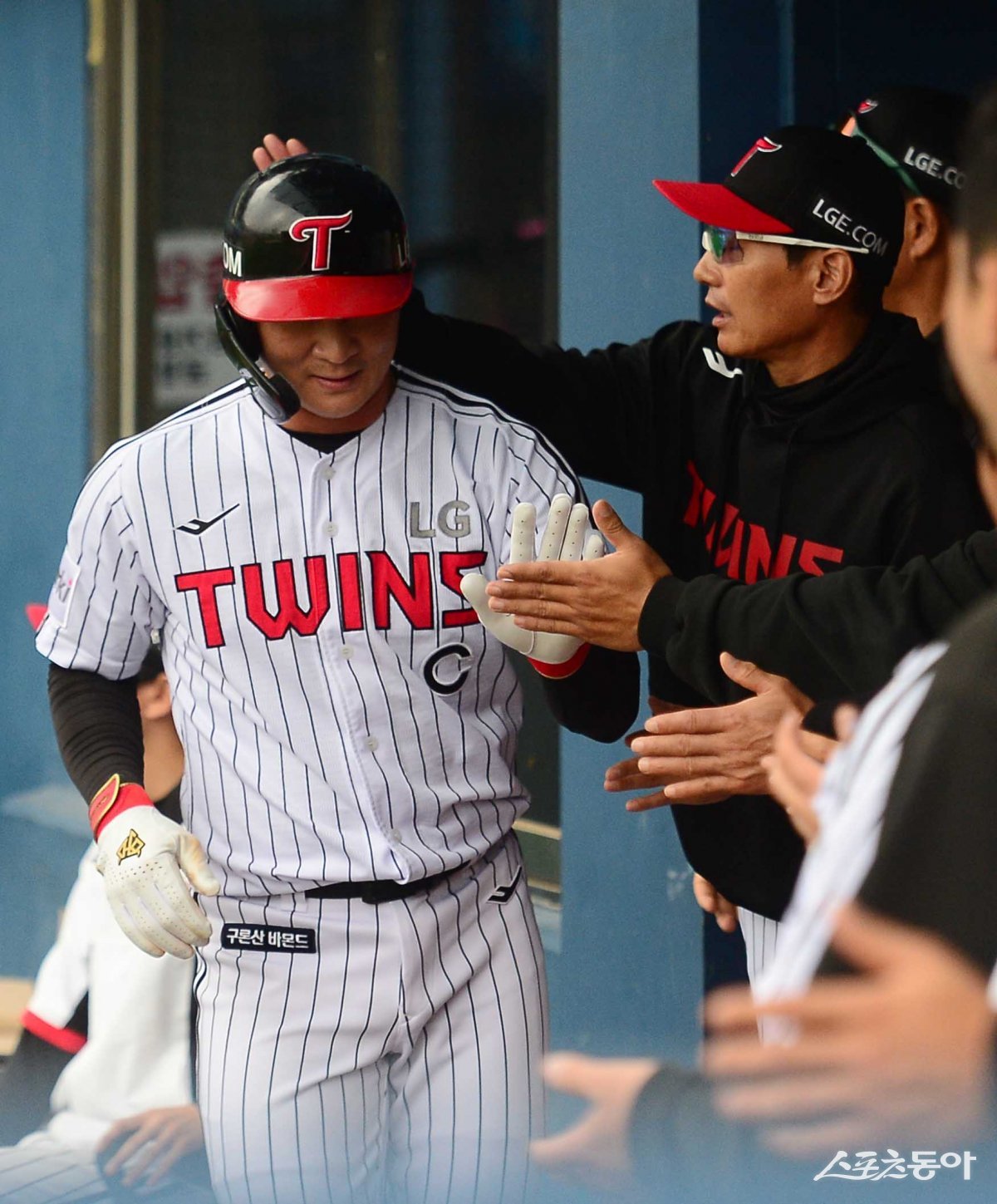 1일 서울 잠실야구장에서 열린 ‘2023 KBO 포스트시즌’ 한국시리즈를 대비한 LG 트윈스와 상무 야구단의 평가전 경기에서 4회말 1사 3루 LG의 희생타 때 3루주자 오지환이 득점에 성공한 후 더그아웃에서 염경엽 감독에 축하를 받고 있다.
