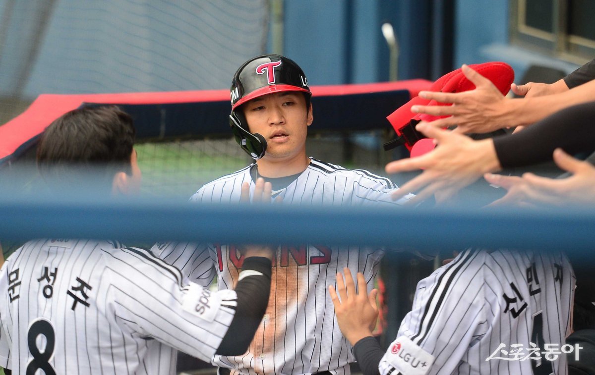 1일 서울 잠실야구장에서 열린 ‘2023 KBO 포스트시즌’ 한국시리즈를 대비한 LG 트윈스와 상무 야구단의 평가전 경기에서 4회말 무사 2루 LG의 적시타 때 2루주자 박해민이 득점에 성공한 후 더그아웃에서 동료들에 축하를 받고 있다.