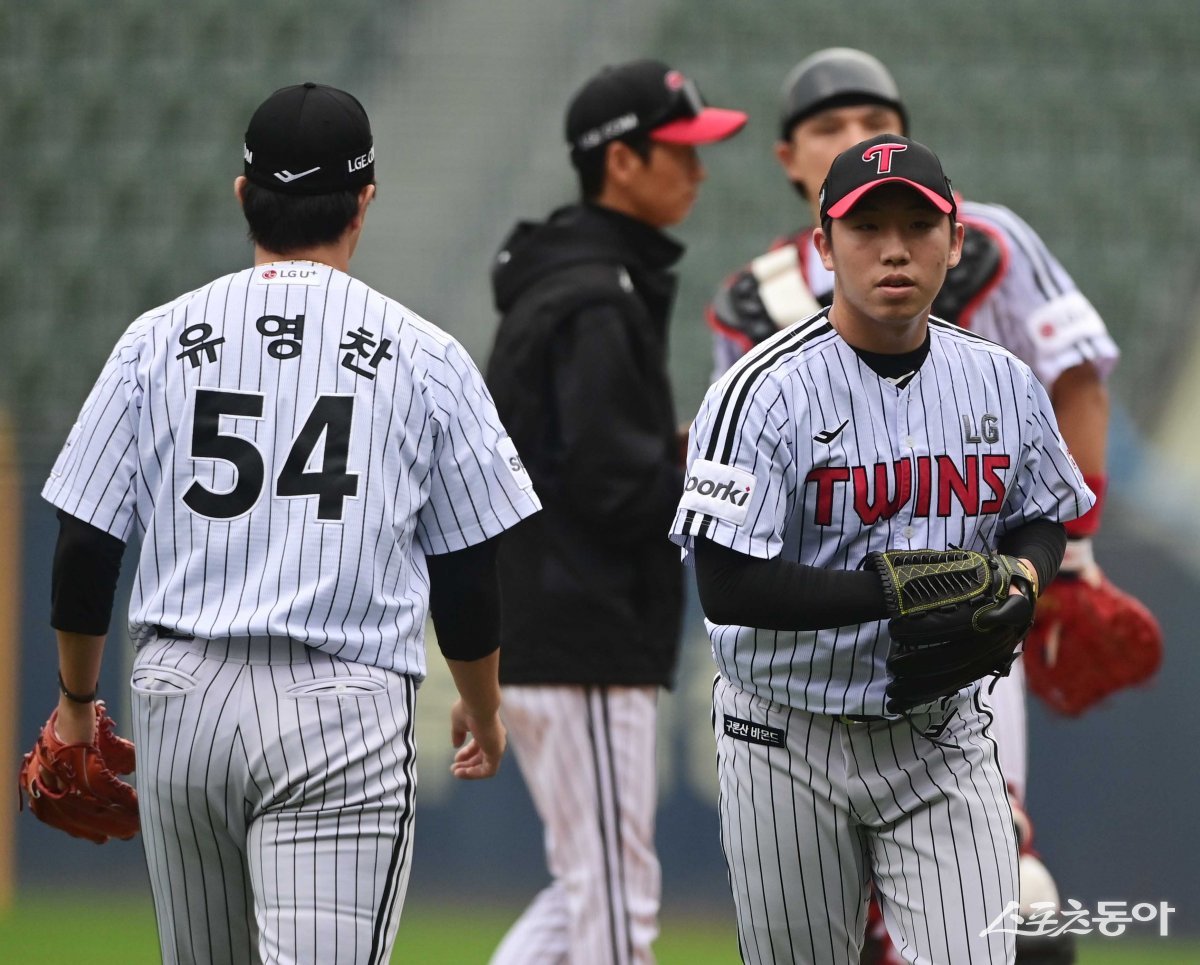 1일 서울 잠실야구장에서 열린 ‘2023 KBO 포스트시즌’ 한국시리즈를 대비한 LG 트윈스와 상무 야구단의 평가전 경기에서 6회초 1사 1, 2루 LG 박명근이 마운드를 내려오고 있다.