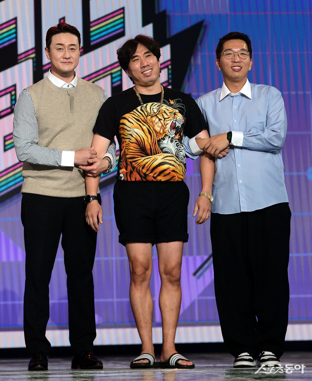 1일 서울 영등포구 KBS별관에서 KBS2 예능프로그램 ‘개그콘서트’ 제작발표회에가 열렸다. 김원효, 정태호, 정범균이 기념촬영을 하고 있다.