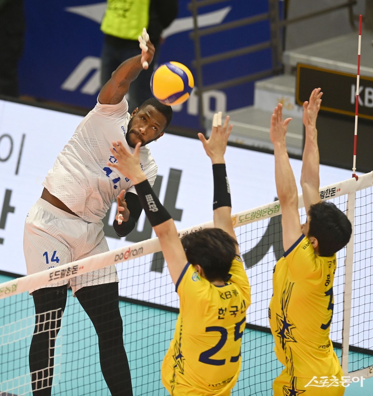 1일 의정부체육관에서 열린 ‘도드람 2023~2024 V-리그’ 남자부 KB손해보험과 삼성화재 경기에서 삼성화재 요스바니가 KB손해보험의 블로킹 사이로 스파이크를 날리고 있다.