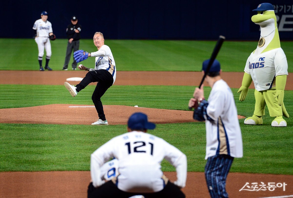 2일 창원NC파크에서 ‘2023 신한은행 SOL KBO리그’ NC 다이노스와 kt 위즈의 플레이오프 3차전 경기가 열렸다. 가수 노브레인이 시구와 시타, 시포를 펼치고 있다.