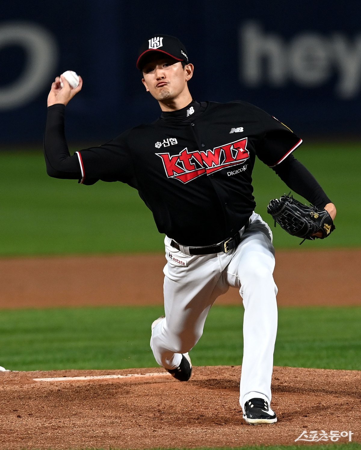 2일 창원NC파크에서 ‘2023 신한은행 SOL KBO리그’ NC 다이노스와 kt 위즈의 플레이오프 3차전 경기가 열렸다. kt 선발투수 고영표가 힘차게 볼을 던지고 있다.