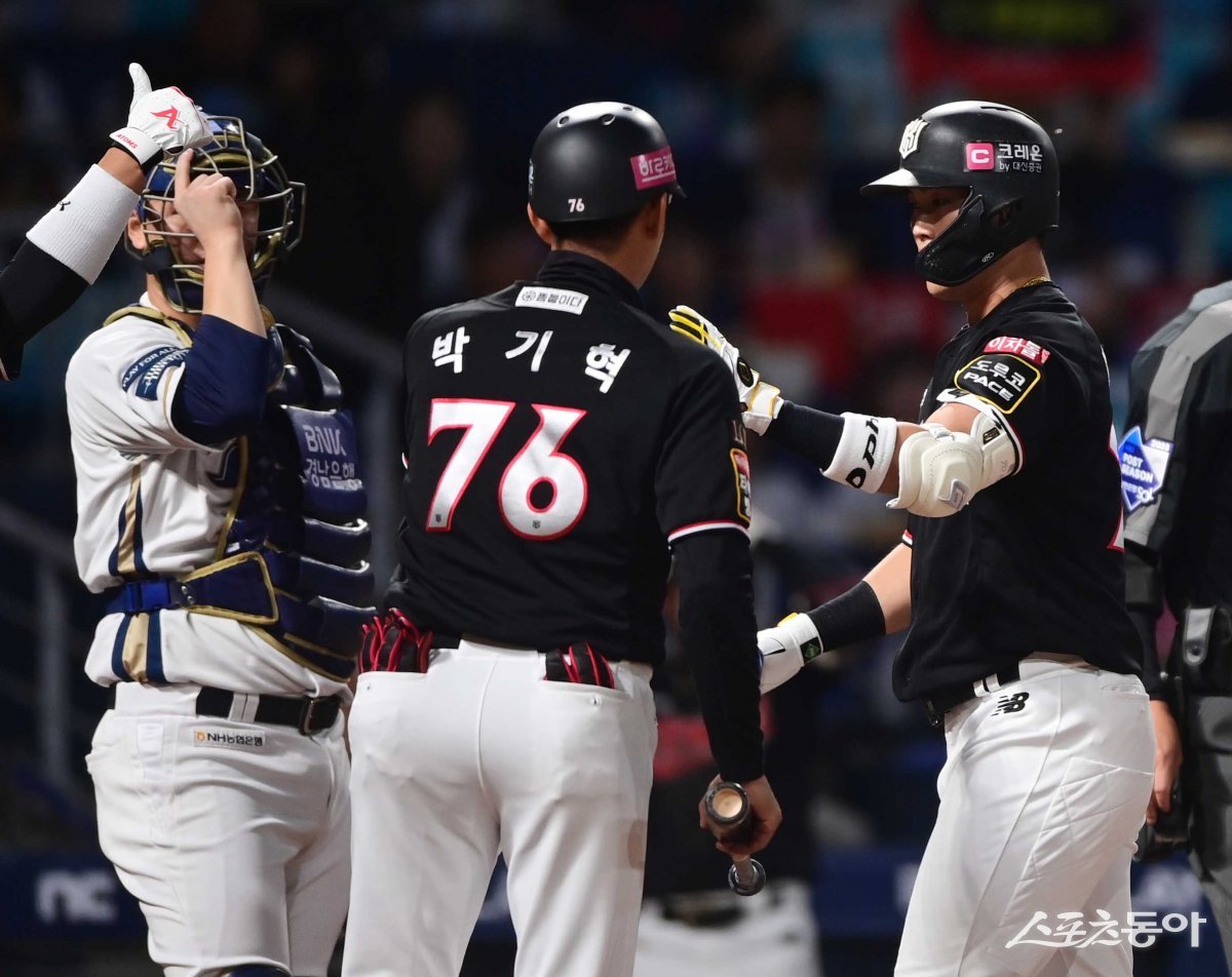 2일 창원NC파크에서 열린 ‘2023 KBO 포스트시즌’ NC 다이노스와 KT 위즈의 플레이오프 3차전 경기에서 2회초 1사 1루 KT 배정대가 선제 좌월 2점 홈런을 친 후 1루코치와 기쁨을 나누고 있다.