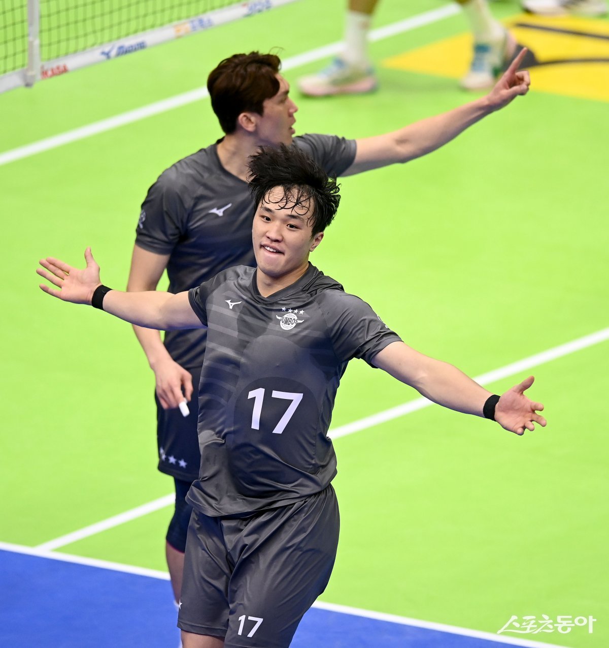 2일 수원체육관에서 열린 ‘도드람 2023~2024 V-리그’ 남자부 한국전력과 대한항공 경기에서 대한항공 임동혁이 블로킹 득점에 성공한 후 기뻐하고 있다.