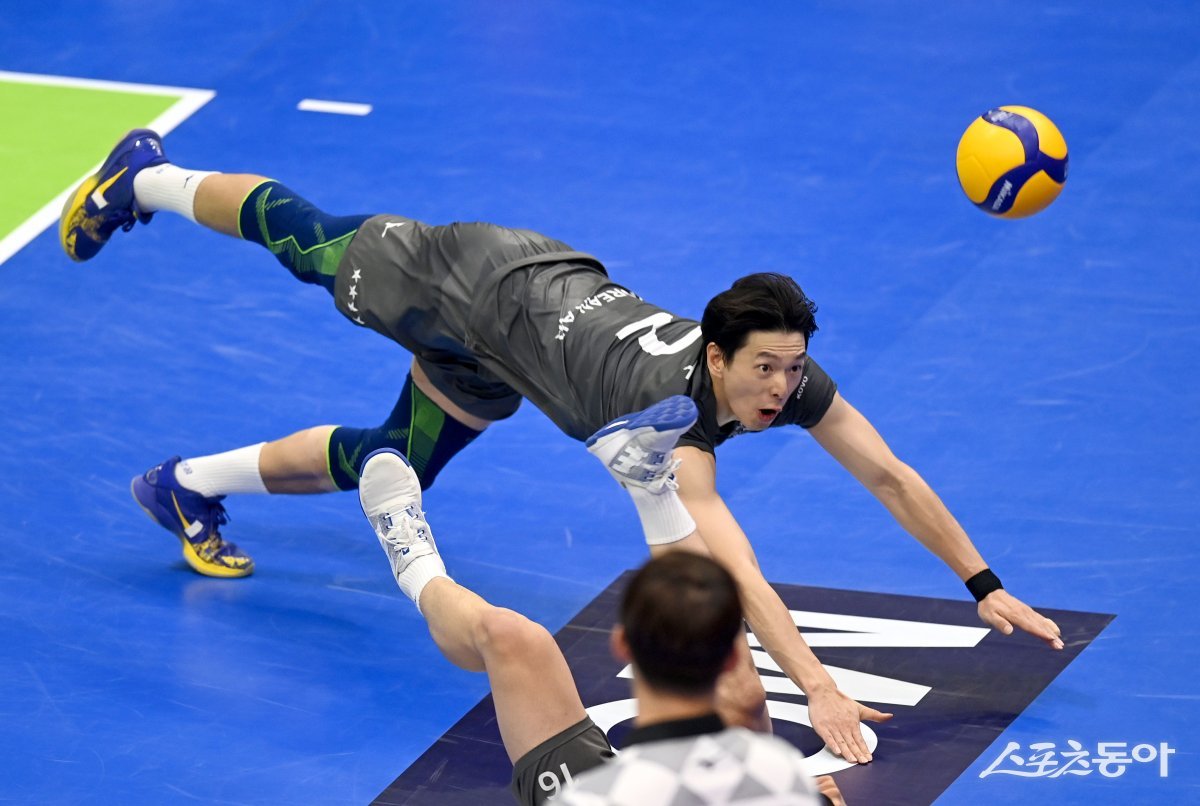 2일 수원체육관에서 열린 ‘도드람 2023~2024 V-리그’ 남자부 한국전력과 대한항공 경기에서 대한하공 한선수가 몸을 날려 디그에 성공하고 있다.
