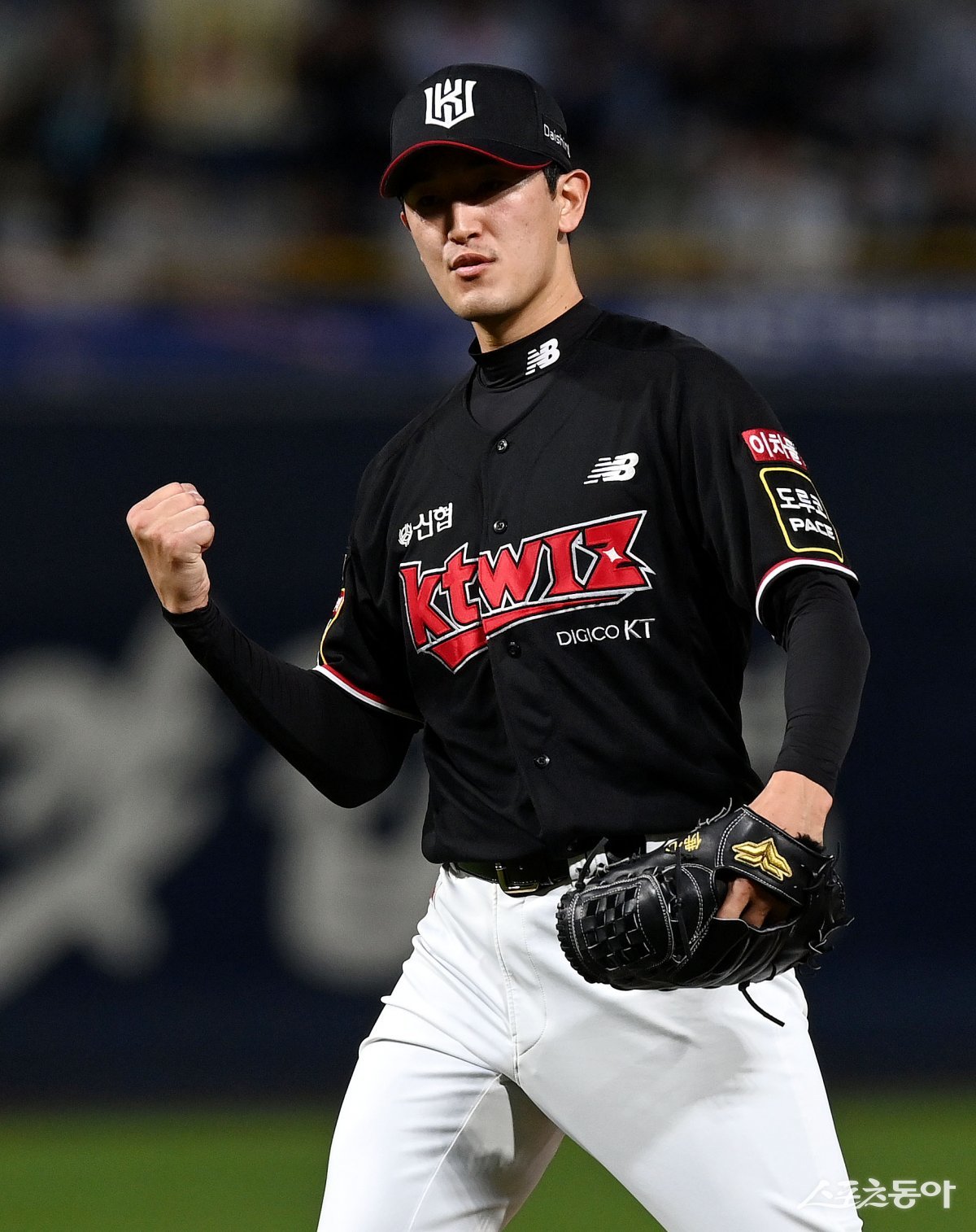 2일 창원NC파크에서 ‘2023 신한은행 SOL KBO리그’ NC 다이노스와 kt 위즈의 플레이오프 3차전 경기가 열렸다. 6회말 2사 1루에서 kt 선발 고영표가 삼진 아웃을 잡은 후 환호하고 있다.