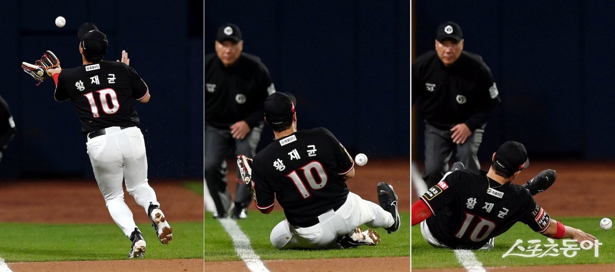 2일 창원NC파크에서 ‘2023 신한은행 SOL KBO리그’ NC 다이노스와 kt 위즈의 플레이오프 3차전 경기가 열렸다. 6회말 무사에서 kt 황재균이 안타성 타구를 놓치고 있다.