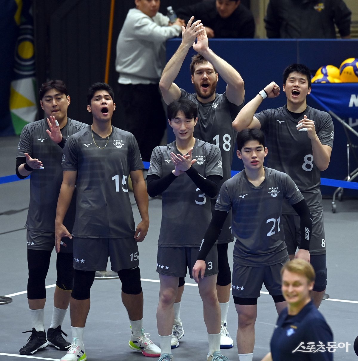 2일 수원체육관에서 열린 ‘도드람 2023~2024 V-리그’ 남자부 한국전력과 대한항공 경기에서 대한항공 링컨이 웜업존에서 응원을 하고 있다.