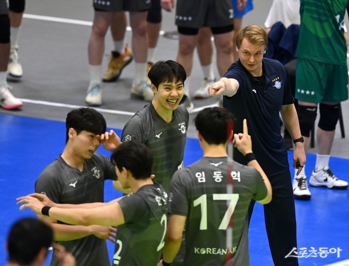 2일 수원체육관에서 열린 ‘도드람 2023~2024 V-리그’ 남자부 한국전력과 대한항공 경기에서 대한항공 틸리카이넨 감독이 작전 지시를 하고 있다.