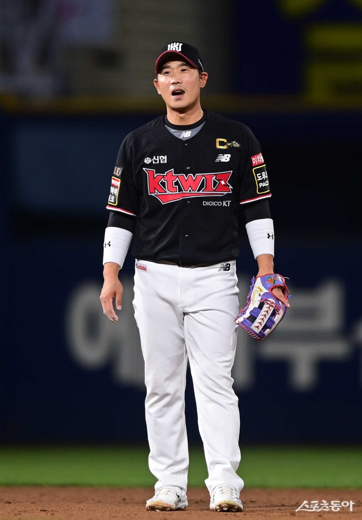 2일 창원NC파크에서 열린 ‘2023 KBO 포스트시즌’ NC 다이노스와 KT 위즈의 플레이오프 3차전 경기에서 5회말 무사 1루 NC의 땅볼 때 KT 박경수가 병살 처리를 놓친 후 아쉬워하고 있다.
