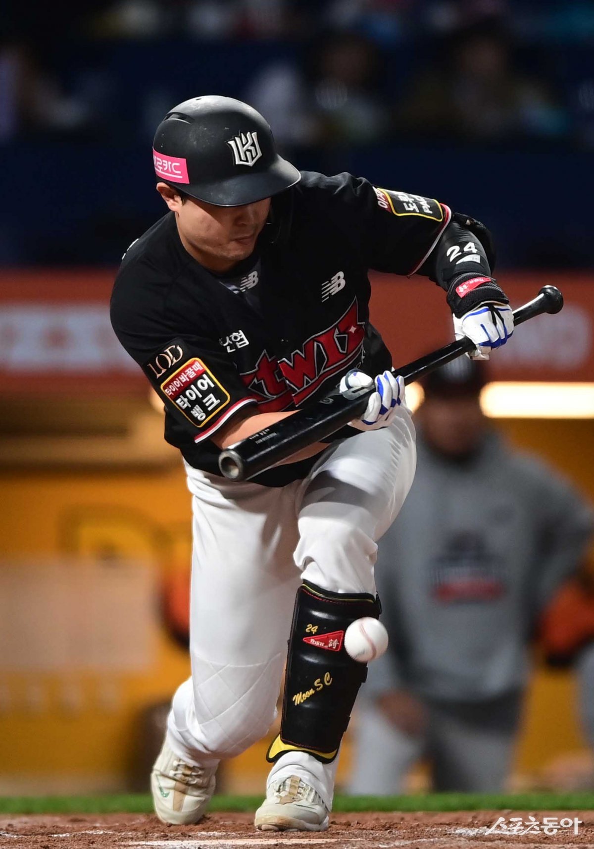 2일 창원NC파크에서 열린 ‘2023 KBO 포스트시즌’ NC 다이노스와 KT 위즈의 플레이오프 3차전 경기에서 4회초 무사 1루 KT 문상철이 번트에 실패하고 있다.