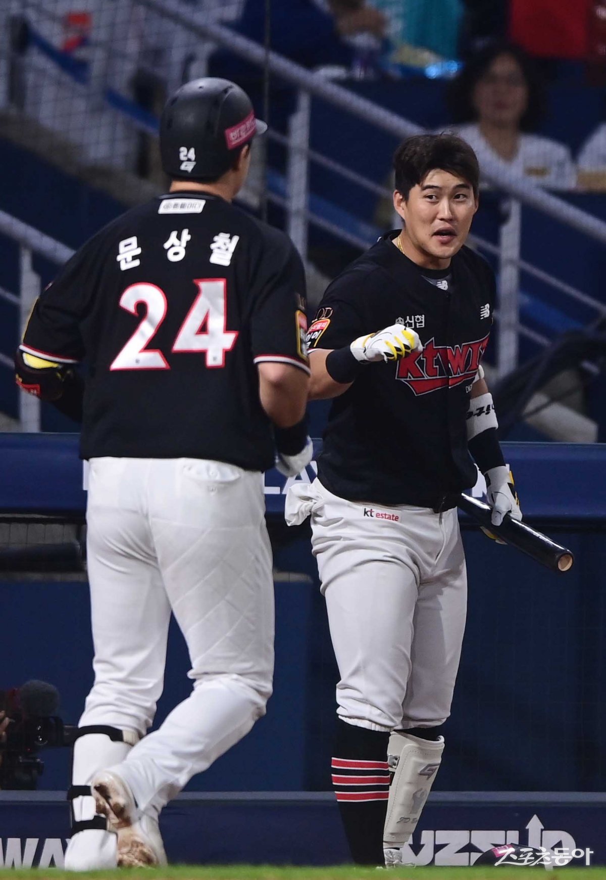 2일 창원NC파크에서 열린 ‘2023 KBO 포스트시즌’ NC 다이노스와 KT 위즈의 플레이오프 3차전 경기에서 7회초 무사 KT 문상철이 좌월 솔로 홈런을 친 후 배정대와 기쁨을 나누고 있다.