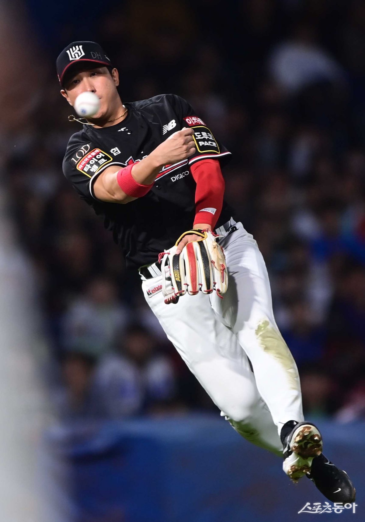 2일 창원NC파크에서 열린 ‘2023 KBO 포스트시즌’ NC 다이노스와 KT 위즈의 플레이오프 3차전 경기에서 7회말 1사 NC의 내야 땅볼 때 KT 황재균이 1루로 송구하고 있다.