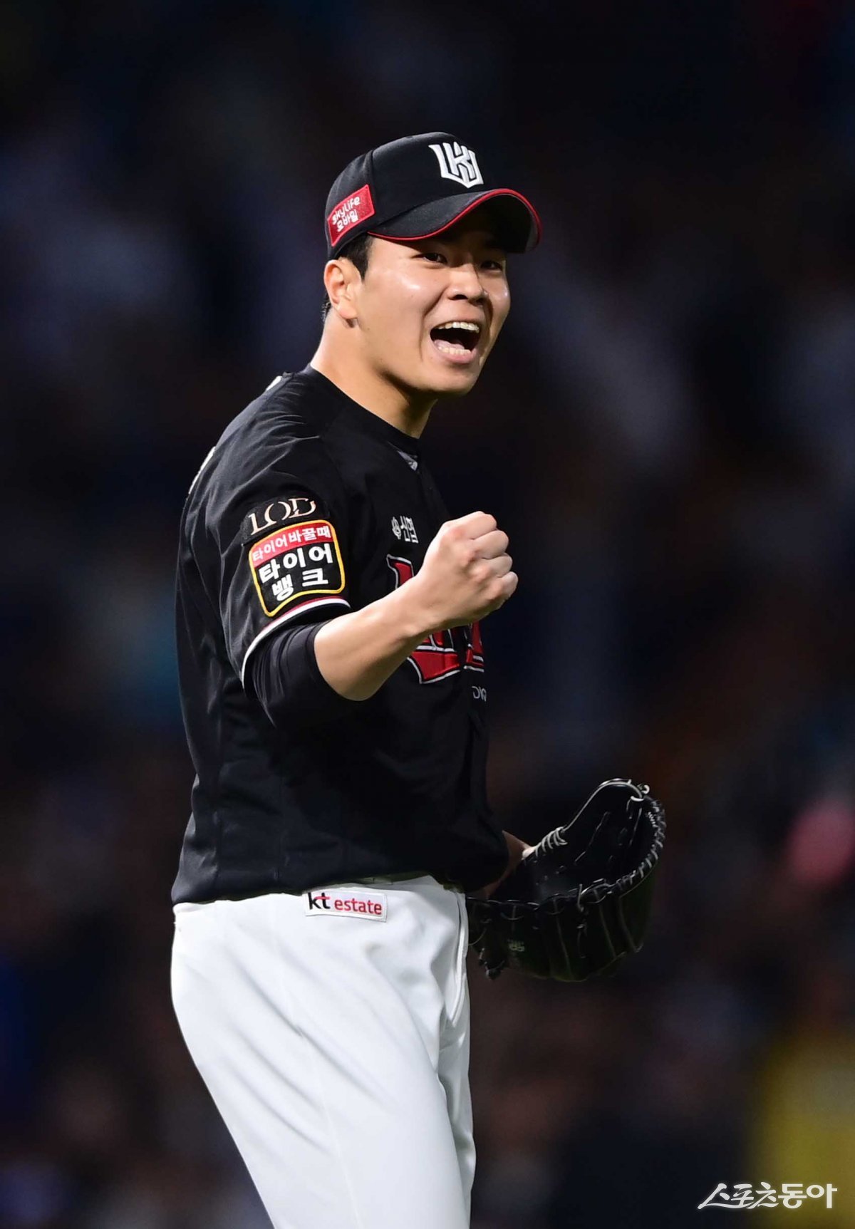 2일 창원NC파크에서 열린 ‘2023 KBO 포스트시즌’ NC 다이노스와 KT 위즈의 플레이오프 3차전 경기에서 7회말 무사 NC의 땅볼 때 KT 손동현이 기뻐하고 있다.