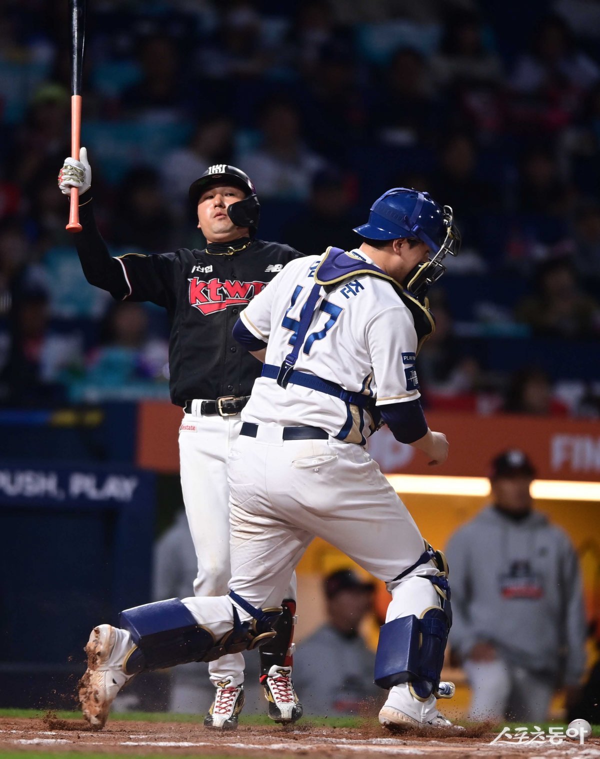 2일 창원NC파크에서 열린 ‘2023 KBO 포스트시즌’ NC 다이노스와 KT 위즈의 플레이오프 3차전 경기에서 7회초 2사 2루 NC에 폭투 때 KT 김상수와 김형준이 충돌하고 있다.