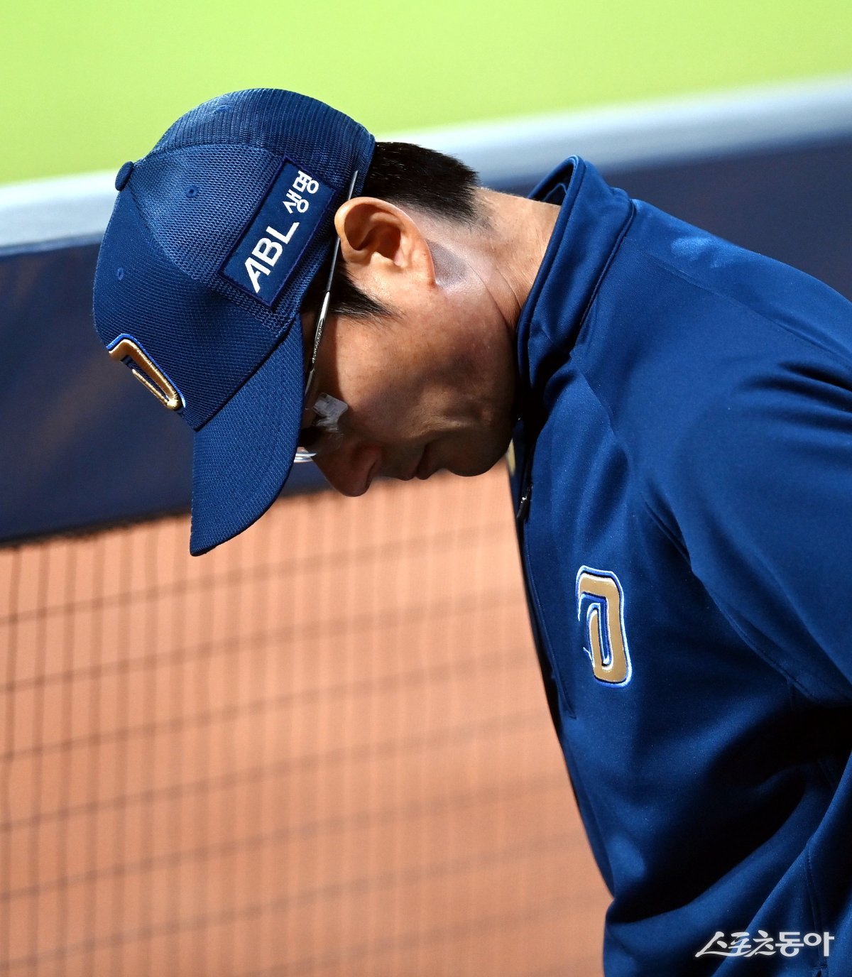 2일 창원NC파크에서 ‘2023 신한은행 SOL KBO리그’ NC 다이노스와 kt 위즈의 플레이오프 3차전 경기가 열렸다. NC 강인권 감독이 고개를 숙이고 있다.