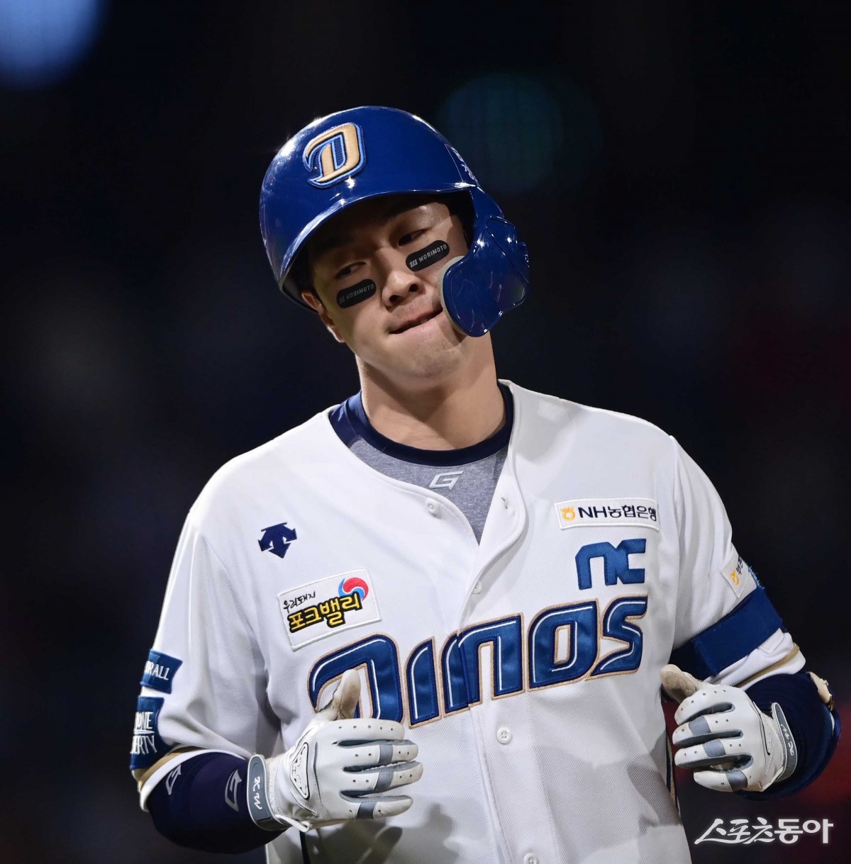 2일 창원NC파크에서 열린 ‘2023 KBO 포스트시즌’ NC 다이노스와 KT 위즈의 플레이오프 3차전 경기에서 9회말 무사 1루 NC 박건우가 뜬공으로 아웃되며 아쉬워하고 있다.