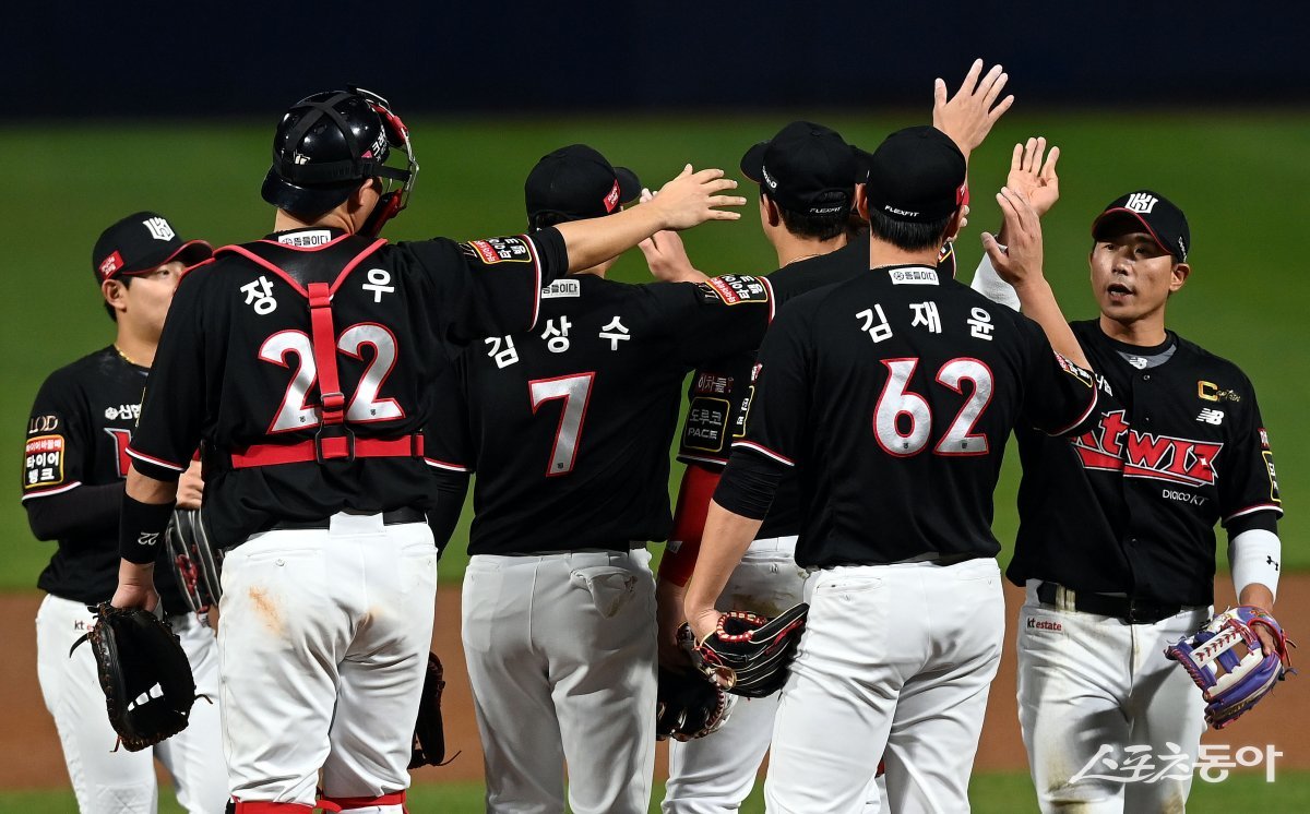 2일 창원NC파크에서 ‘2023 신한은행 SOL KBO리그’ NC 다이노스와 kt 위즈의 플레이오프 3차전 경기가 열렸다. kt가 NC를 상대로 3-0 승리를 거둔 후 선수들이 그라운드에서 기쁨을 나누고 있다.