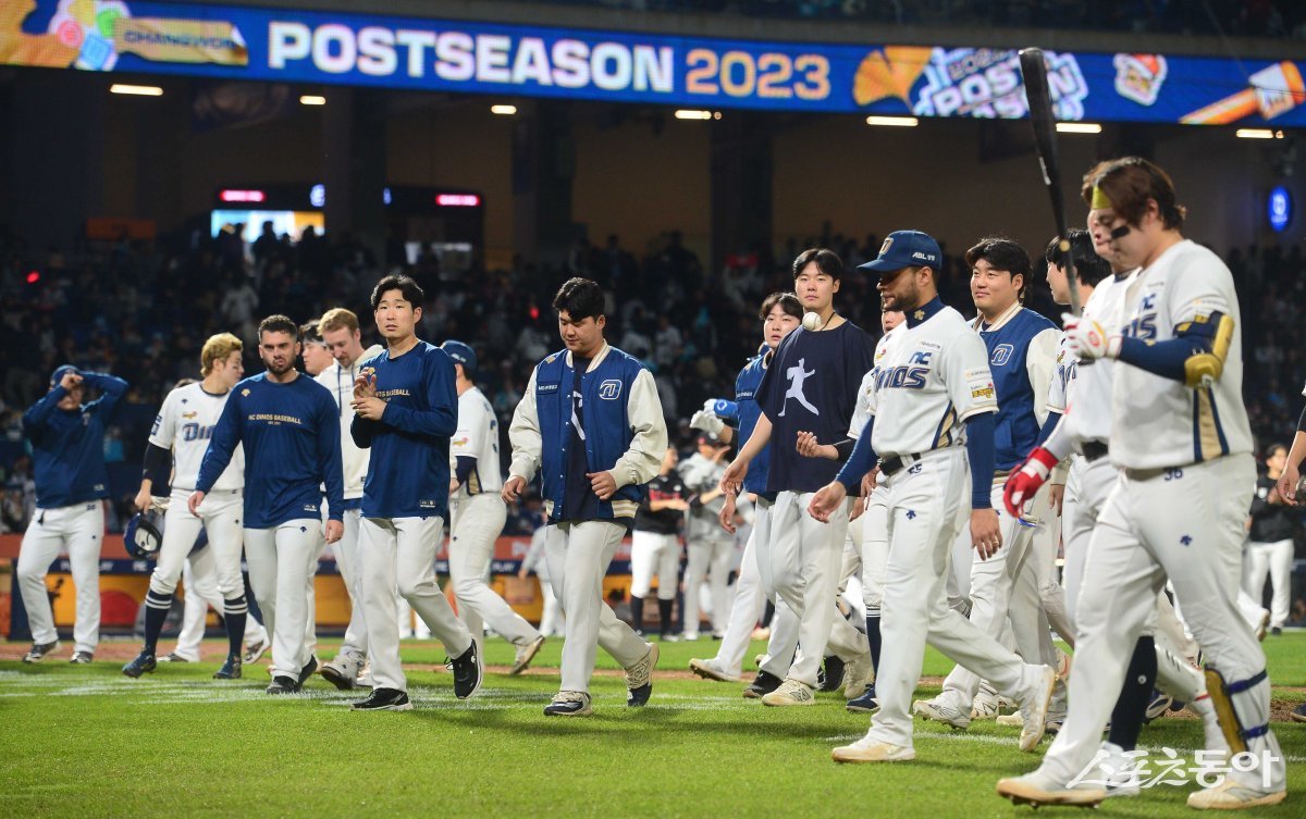2일 창원NC파크에서 열린 ‘2023 KBO 포스트시즌’ NC 다이노스와 KT 위즈의 플레이오프 3차전 경기에서 0-3으로 패한 NC 선수들이 아쉬워하고 있다.