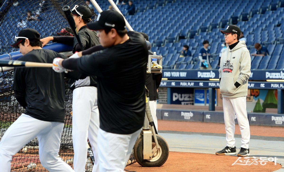 3일 창원NC파크에서 ‘2023 신한은행 SOL KBO리그’ NC 다이노스와 kt 위즈의 플레이오프 4차전 경기가 열린다. 경기 전 kt 이강철 감독이 훈련을 지켜보고 있다.