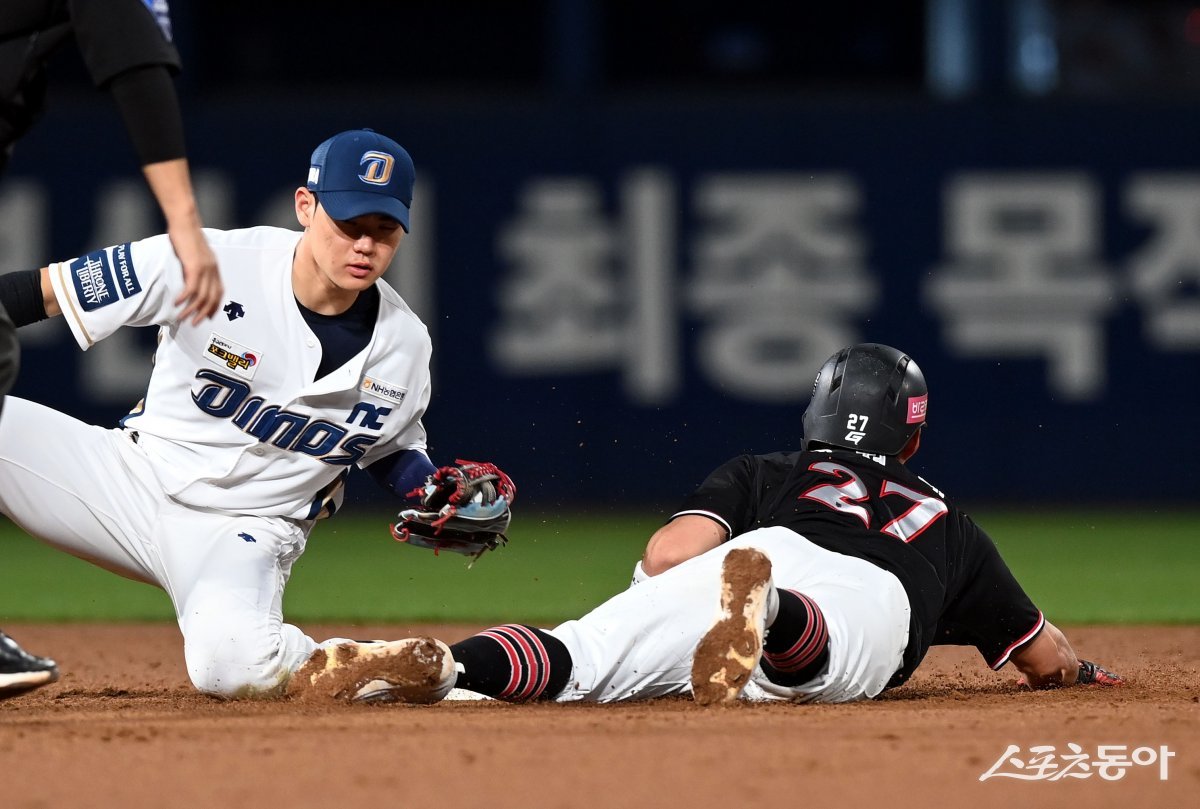 3일 창원NC파크에서 ‘2023 신한은행 SOL KBO리그’ NC 다이노스와 kt 위즈의 플레이오프 4차전 경기가 열렸다. 3회초 1사 1루에서 NC 김주원이 2루 도루를 시도하던 kt 배정대를 태그 아웃시키고 있다.