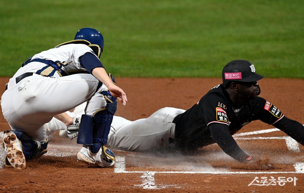 3일 창원NC파크에서 ‘2023 신한은행 SOL KBO리그’ NC 다이노스와 kt 위즈의 플레이오프 4차전 경기가 열렸다. 1회초 1사 1, 3루에서 희생플라이 때 kt 3루 주자 알포드가 득점을 올리고 있다.