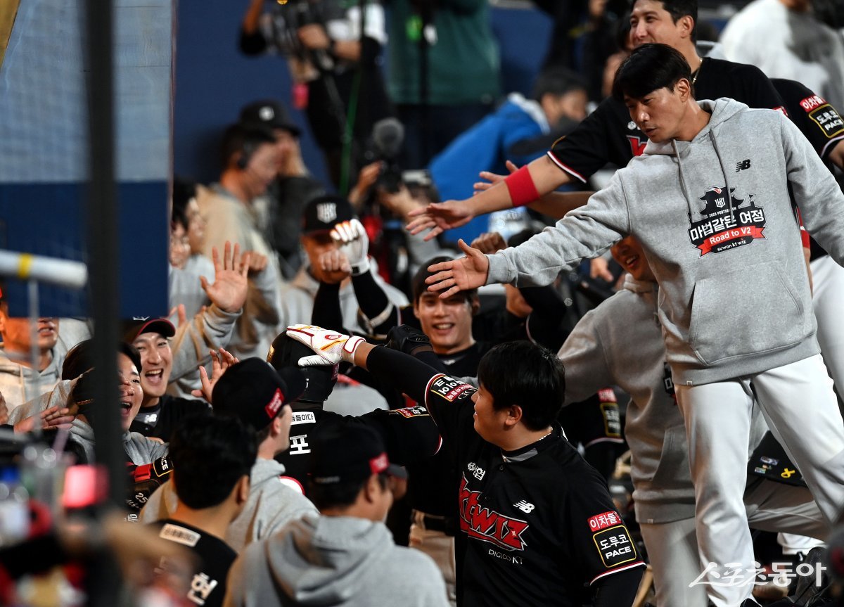 3일 창원NC파크에서 ‘2023 신한은행 SOL KBO리그’ NC 다이노스와 kt 위즈의 플레이오프 4차전 경기가 열렸다. 8회초 무사에서 kt 알포드가 솔로 홈런을 쏘아 올린 후 동료들의 환영을 받고 있다.