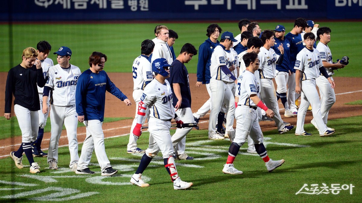 3일 창원NC파크에서 ‘2023 신한은행 SOL KBO리그’ NC 다이노스와 kt 위즈의 플레이오프 4차전 경기가 열렸다. kt에 2-11로 패한 NC 선수들이 더그아웃으로 향하고 있다.